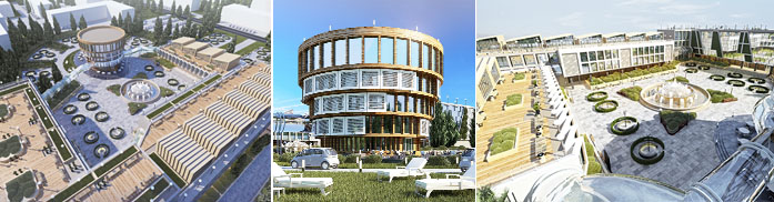 Четыре других планируемых объекта проходят по границе двух природных стихий: земли и воды. Эти сооружения подчиняются больше городской застройке, но при этом не ограничиваются свободой форм. Отдаленно напоминая своим объемом гальку или булыжные камни на морском берегу, они аккуратно вплетают проектируемый комплекс в планировочную структуру города и отчасти повторяют застройку набережной.